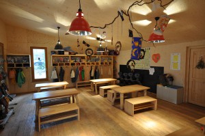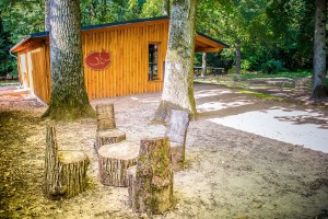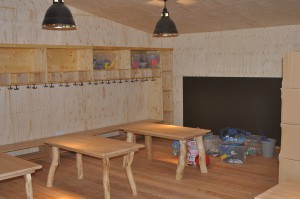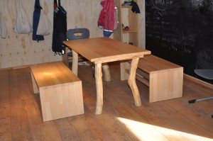 Tische deren Beine aus kleinen Stämmen gefertigt wurden, bieten Platz zum basteln und Essen.