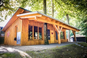 Die Hütte, eingeweiht im Juli 2015, bietet Schutz bei Schlechtwetter Phasen. Gebaut aus Odenwälder Holz von Odenwälder Firmen schmiegt sie sich in den alten Baum Bestand ein.