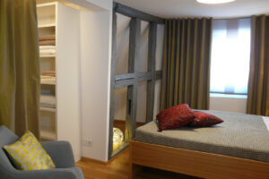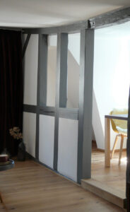 Der Großteil der Möblierung für diese Wohnung in dem über 450 Jahre alten Fachwerk-Denkmal wurde speziell für die Wohnung entworfen und von einer lokalen Schreinerei mit viel Können und Liebe gefertigt.