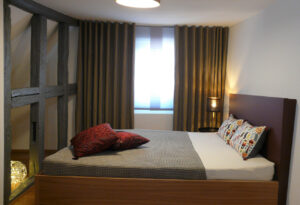 „Klare freundliche Innenarchitektur mit modernen Elementen trifft auf wohnlich warme Fachwerk-Konstruktion. Das Zusammenwirken von Alt und Neu schafft ein besonderes Ambiente. Man fühlt sich gleich zuhause!“