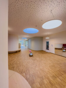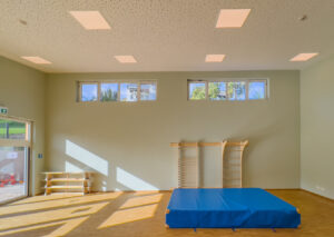Die großzügigen Räume sind lichtdurchflutet. Die offene Konzeption ermöglicht es jedem Kind sich in seiner Einzigartigkeit zu entwickeln. In Atelier, Bauraum, Spielraum und Nestgruppe können die 50 Kita-Kinder und 24 Krippenkinder ihre Fähigkeiten frei entfalten. Ein Turnraum bietet viel Platz zum Toben. In den Schlafräumen laden gemütliche Podeste und beruhigendes Licht zum Träumen und Ruhen ein.