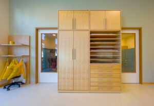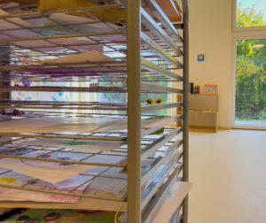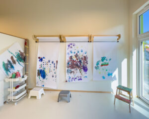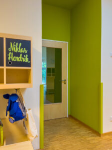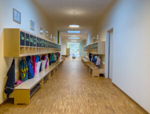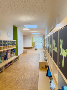 Das offene Konzept der Kita wird durch einen Rollenspielschrank und Spiegel im Flur unterstützt, die zu Verkleidungspartys einladen und den langen Flur der Kita zum Laufsteg umfunktionieren. Individuell beschriftbare Garderoben bieten jedem Kind Platz zum unterbringen von Kleidung und Gebasteltem.