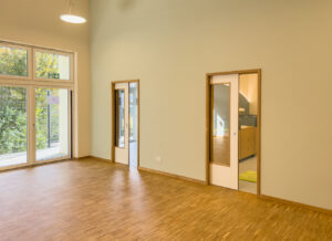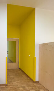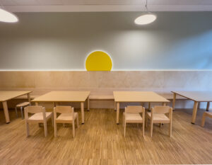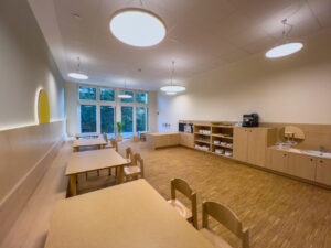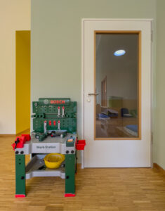 Aber nicht nur für die Kleinen sind beste Voraussetzungen zum Spielen, Lernen und Ausruhen geschaffen worden. Im Pausenraum mit Küchenzeile und Sofa haben die Erzieher*innen viel Platz um sich auszutauschen und zu entspannen. Im großen Besprechungsraum können Meetings abgehalten werden und ein zusätzlicher Elternraum bietet die Möglichkeit für den Austausch zwischen Erzieher*innen und Eltern. Im angrenzenden Wirtschaftsraum kann gewaschen und getrocknet werden. Alle Räume sind durch kurze Laufwege erreichbar und ermöglichen einen reibungslosen Tagesablauf.