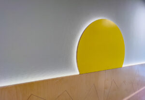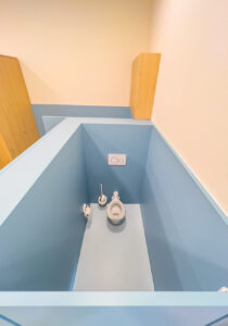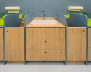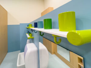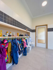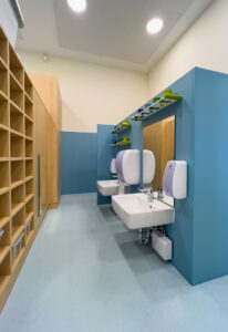 Die Wasch- und Wickelräume verbinden jeweils zwei Gruppen miteinander. Neu ist hierbei die Möglichkeit des Trennens der Sanitärräume in zwei Bereiche, um für zukünftige Pandemien gewappnet zu sein. Im Empfangsbereich des Kindergartens wird an geschwungenen Wandbänken die Möglichkeit zum Schuhwechsel angeboten. An die Wasch- und Wickelräume angrenzende Schmutzschleusen bieten Platz für die Matschhosen und verbinden das Außengelände mit den Gruppenräumen.