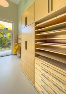 Die hellen Möbel in Ahorn kombiniert mit freundlichen Wandfarben und dem geölten Eichenboden lassen für Kinder und Erzieher*innen eine Wohlfühl-Atmosphäre entstehen.